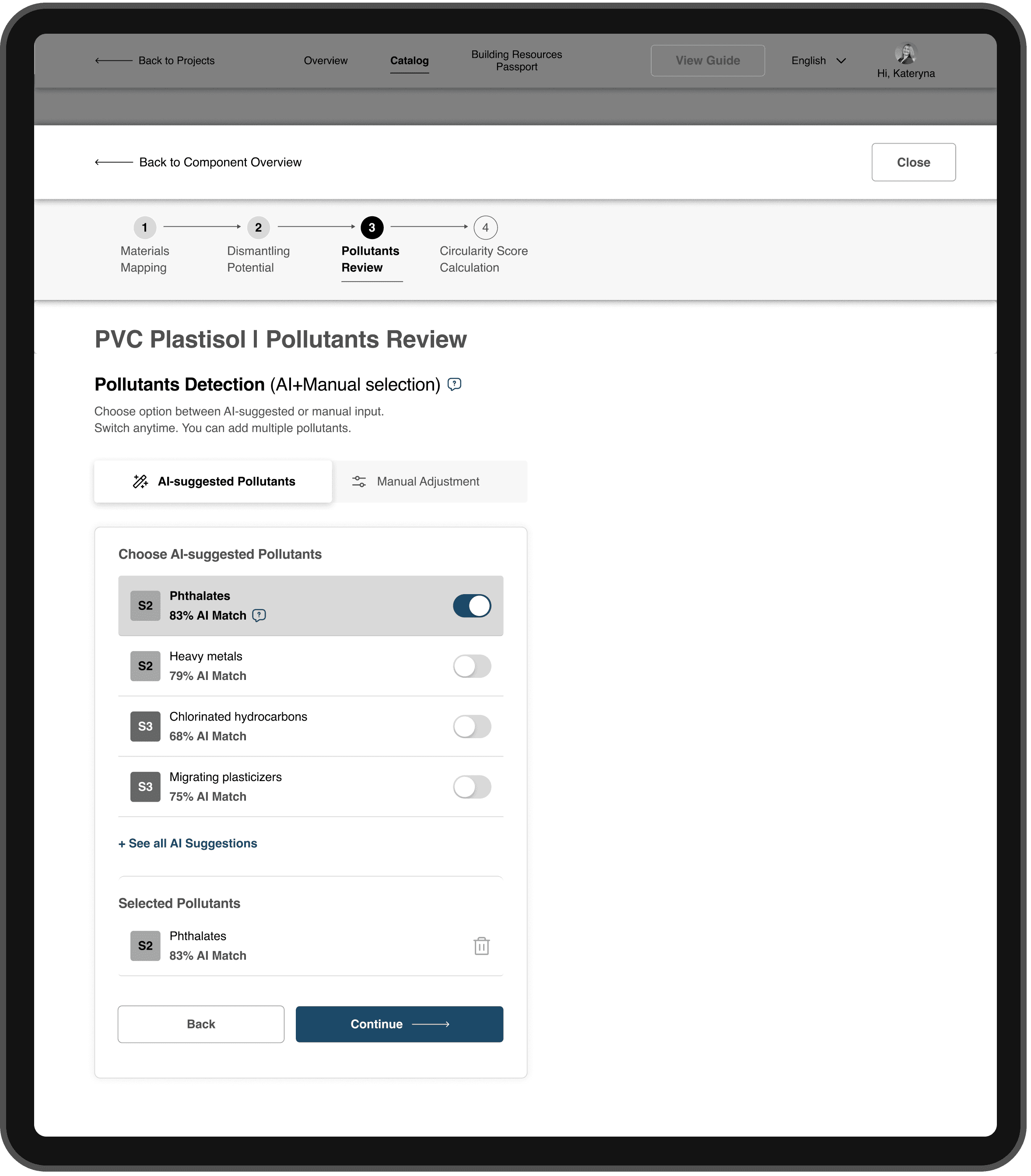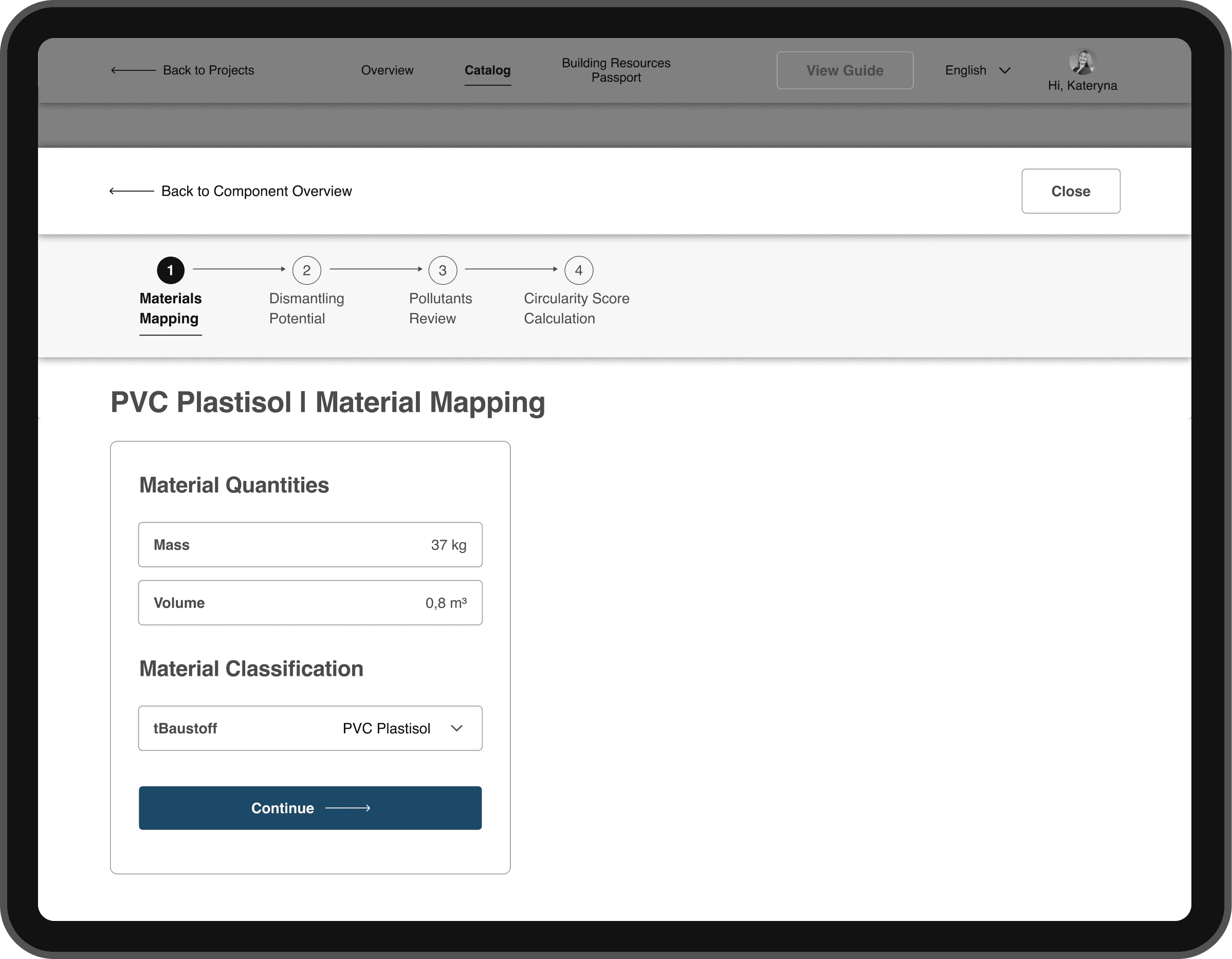 The Component Review and the Circularity Score calculation for each material are designed as an overlay page. This keeps the user anchored in the Missing Data workflow while providing a dedicated, focused workspace for completing material-specific inputs.