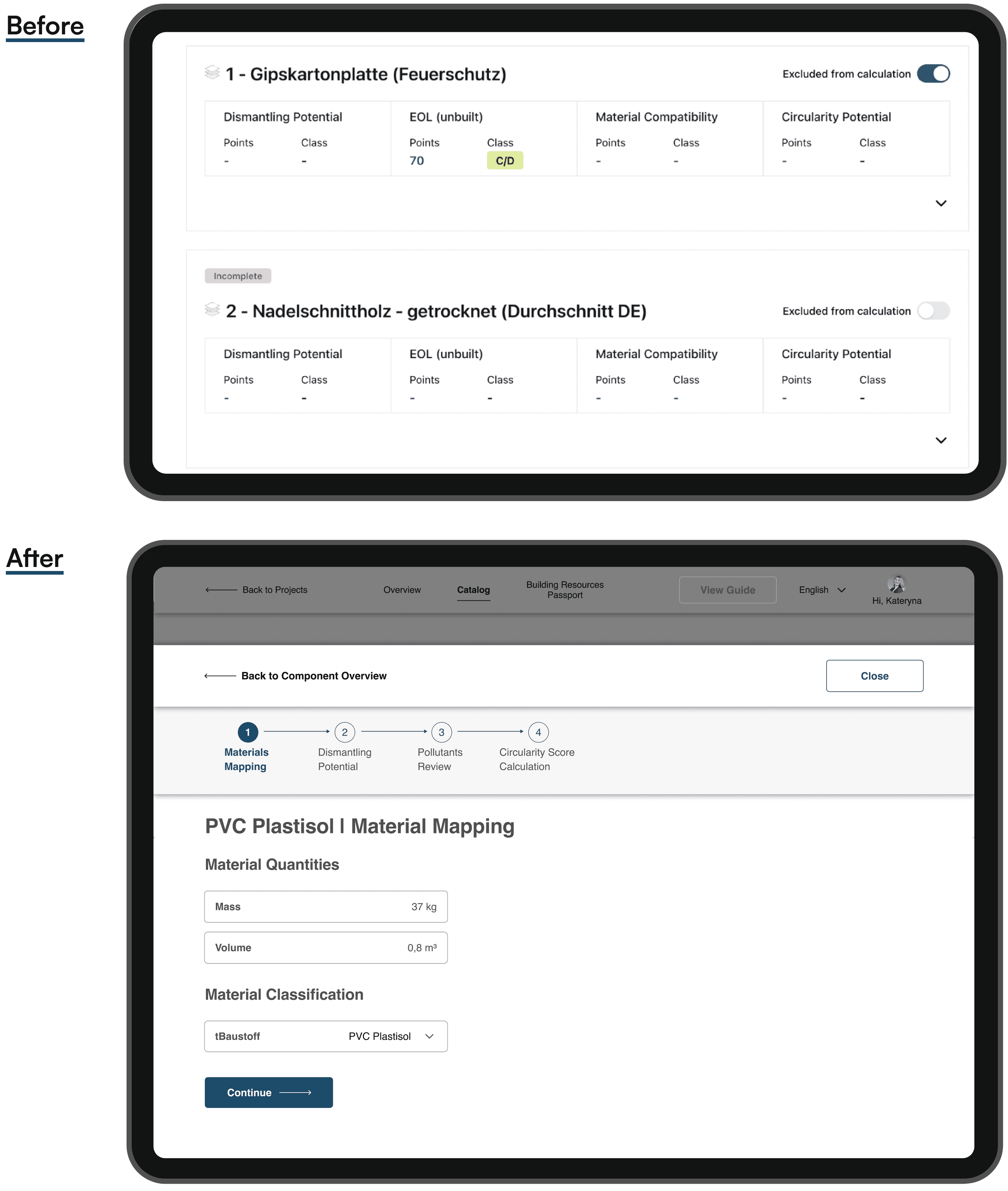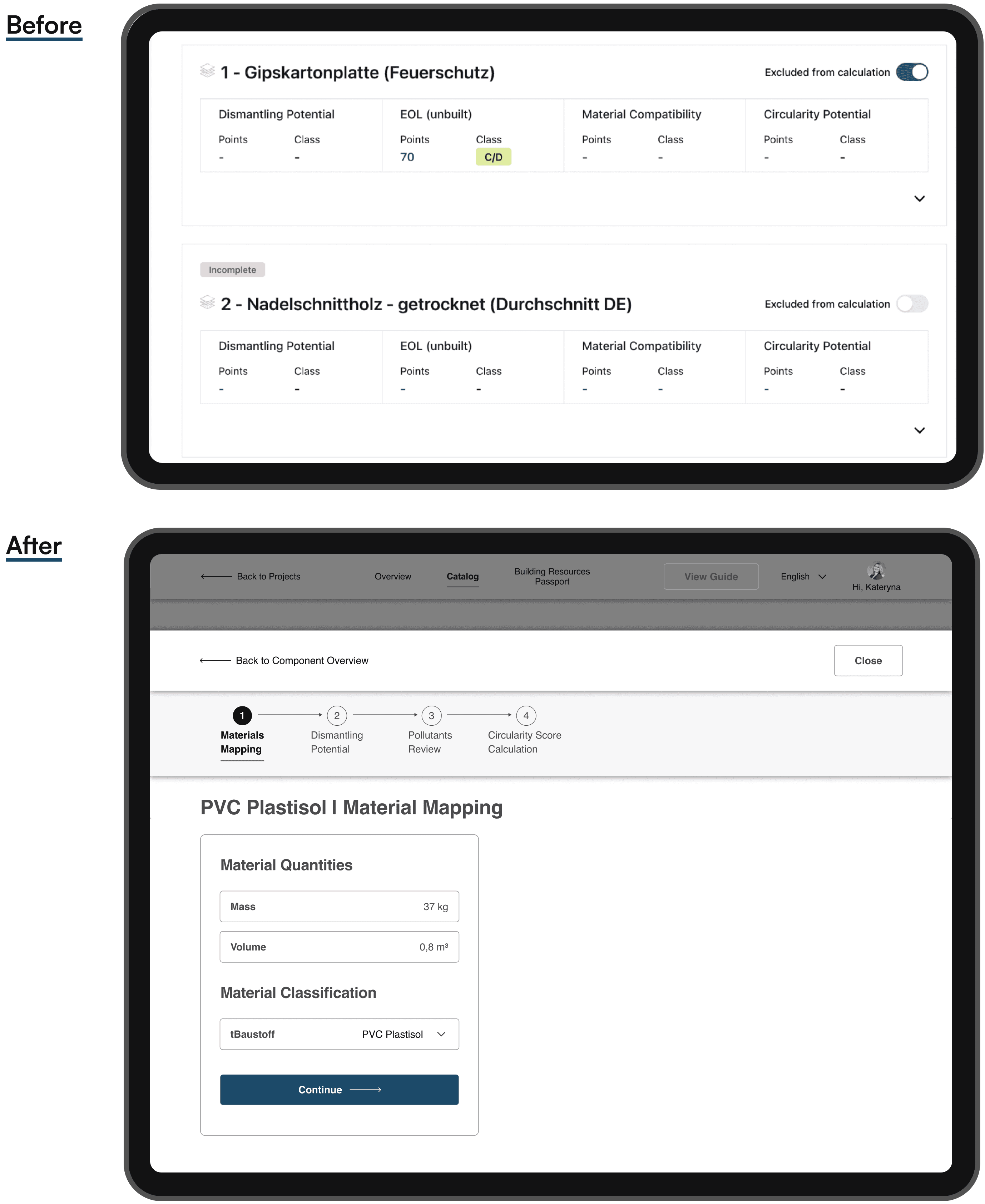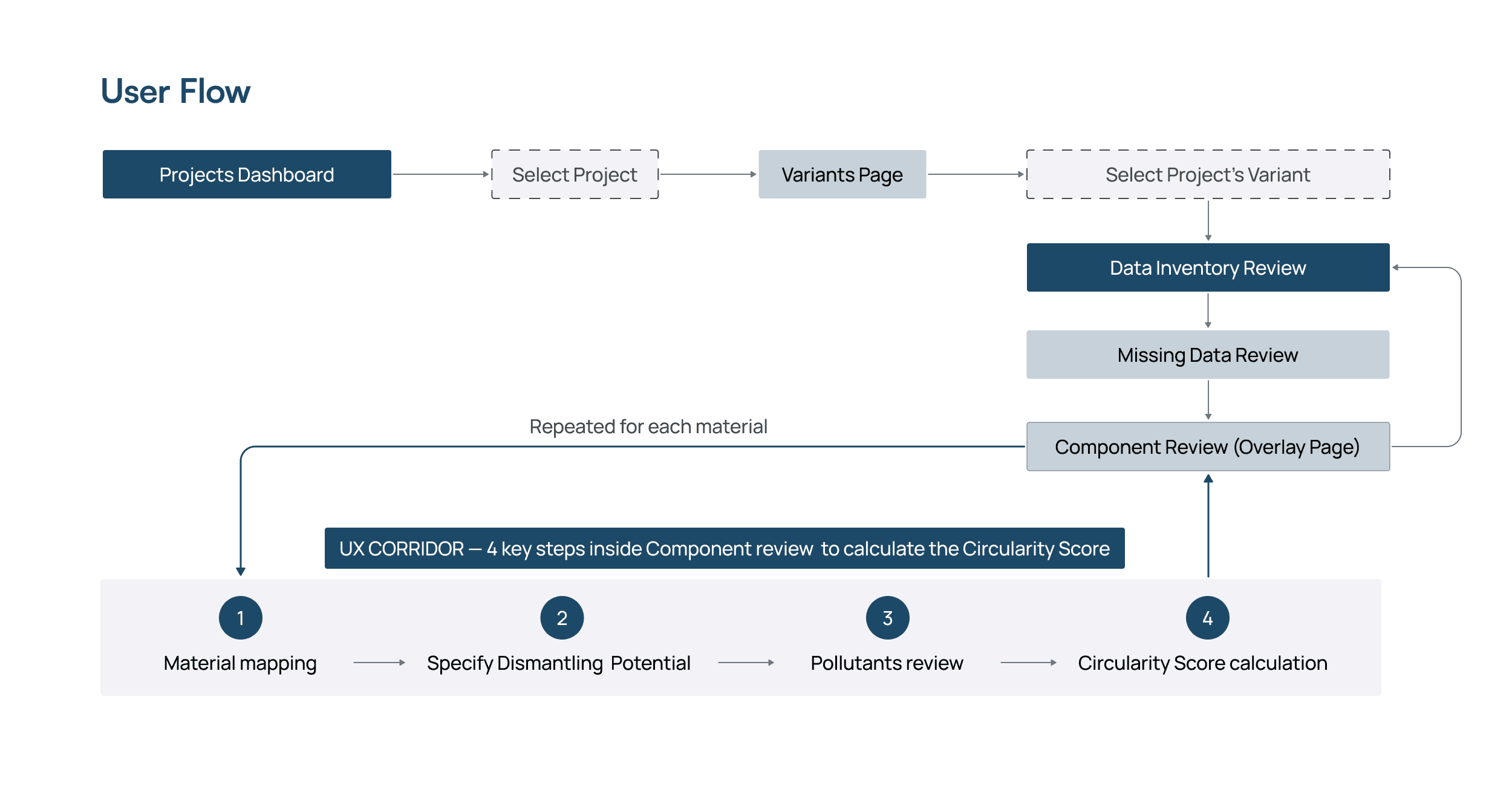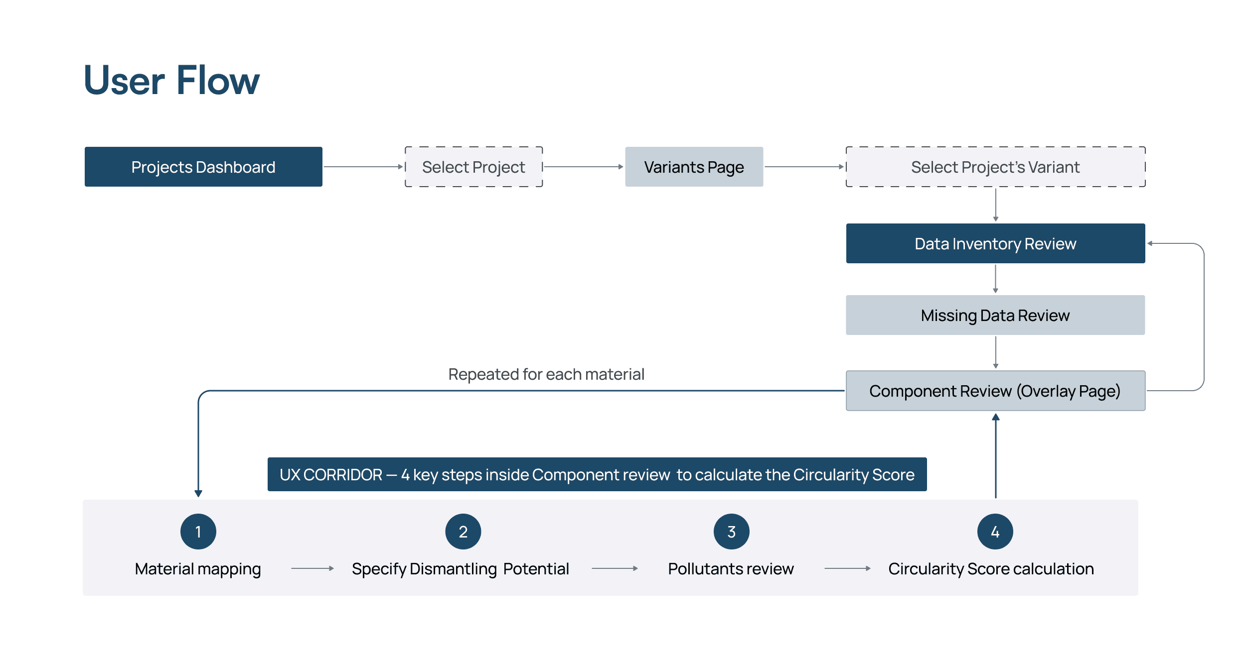 Low transparency of the calculation process → structured the core actions into a 4-step “UX Corridor” (material mapping, dismantling potential, pollutants review with AI support, score calculation), so users see what’s required to reach a valid Circularity Score.