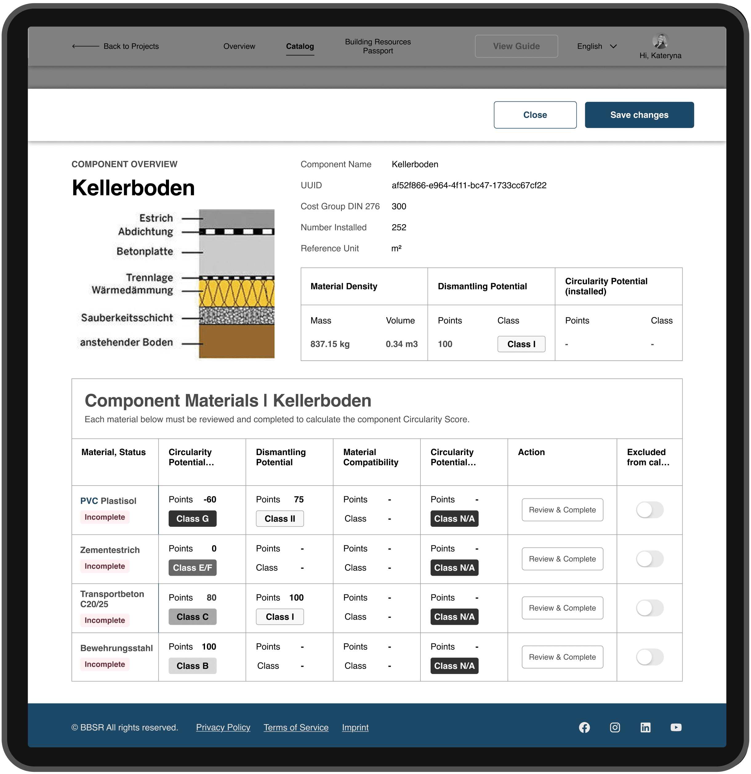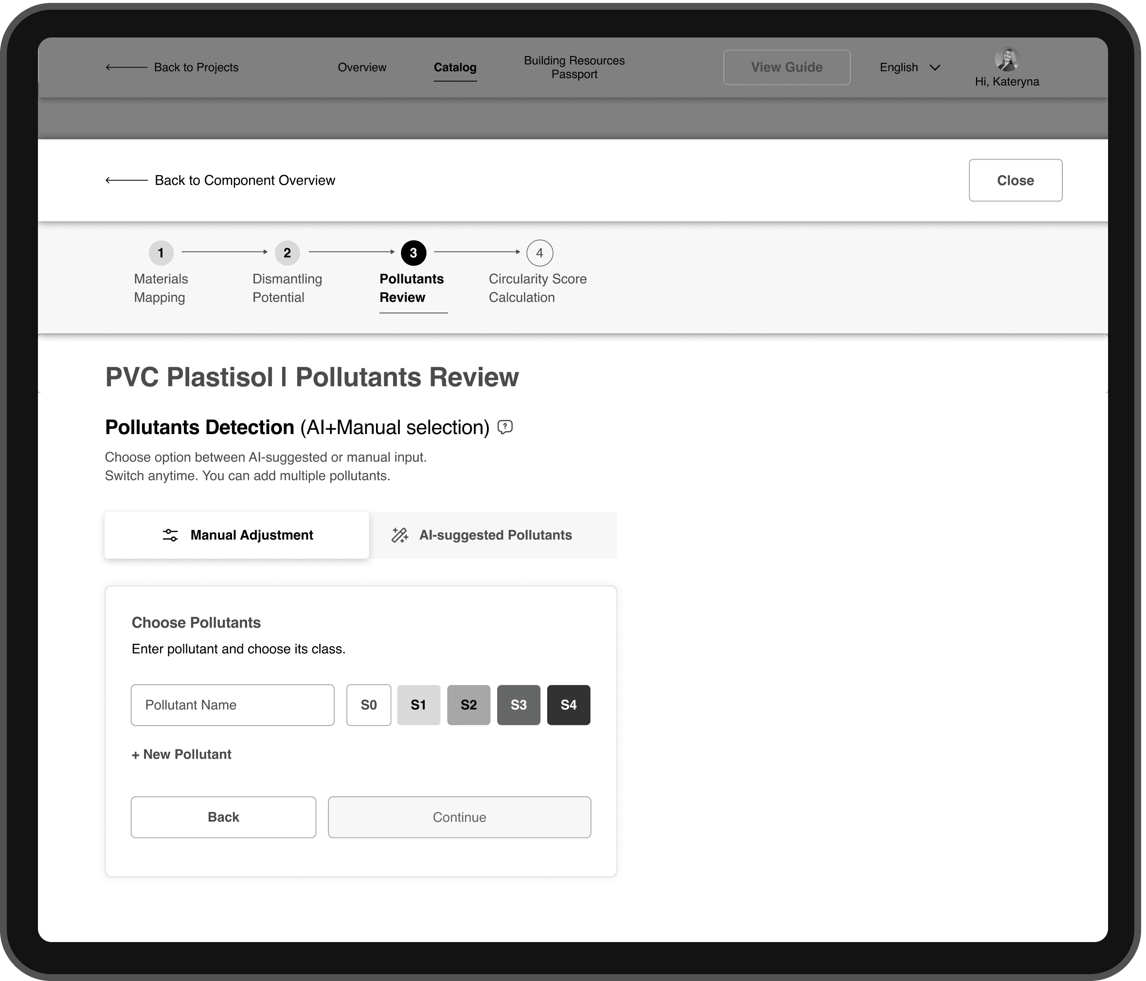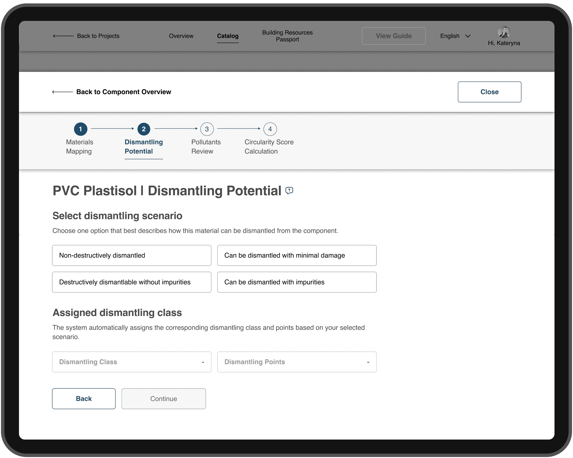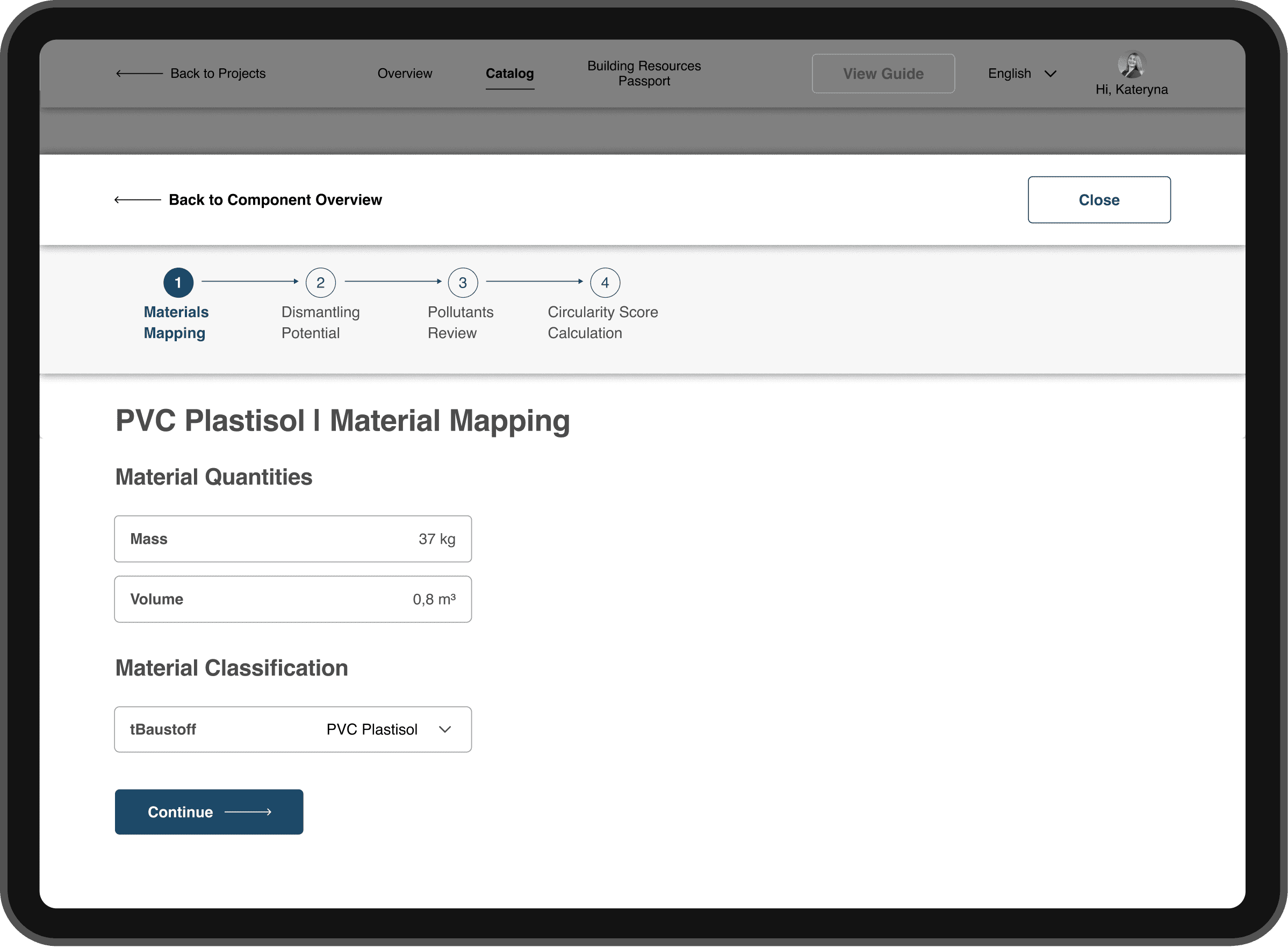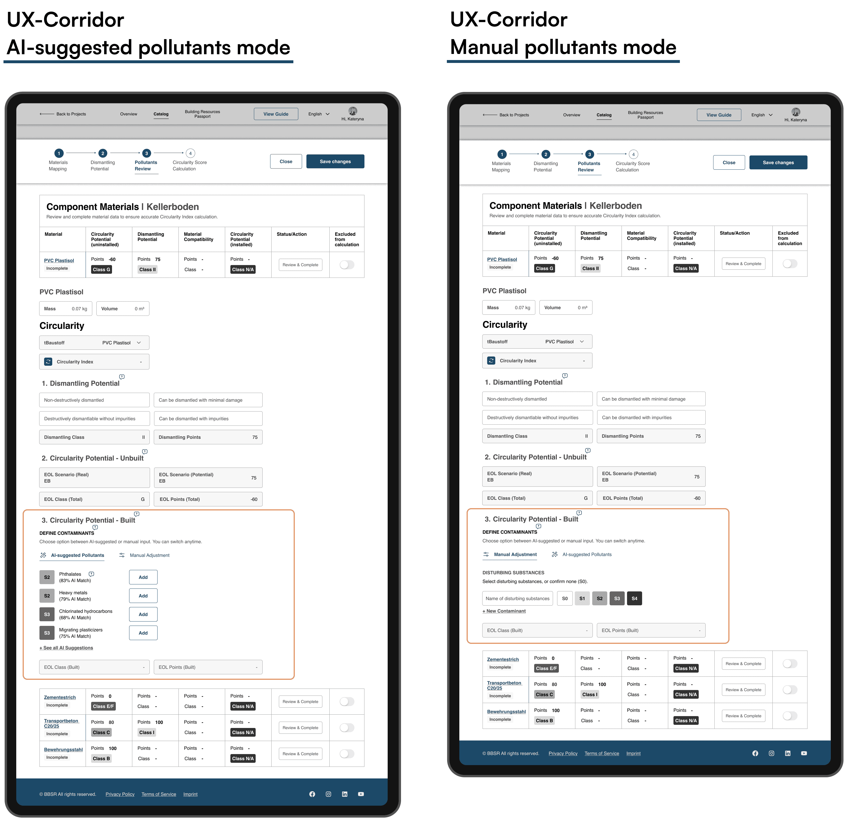 Low transparency of the calculation process → structured the core actions into a 4-step “UX Corridor” (material mapping, dismantling potential, pollutants review with AI support, score calculation), so users see what’s required to reach a valid Circularity Score.