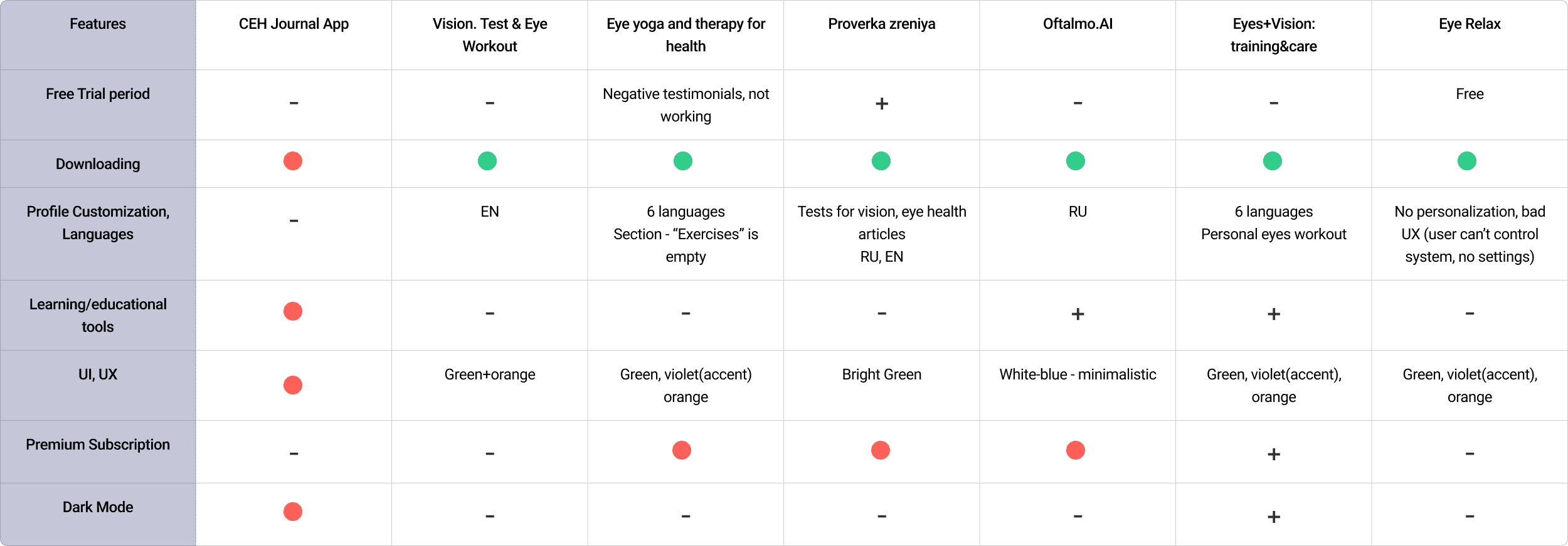 Competitive analysis of 15 projects showed that most vision training apps don't offer a trial and prompt users to pay upfront.