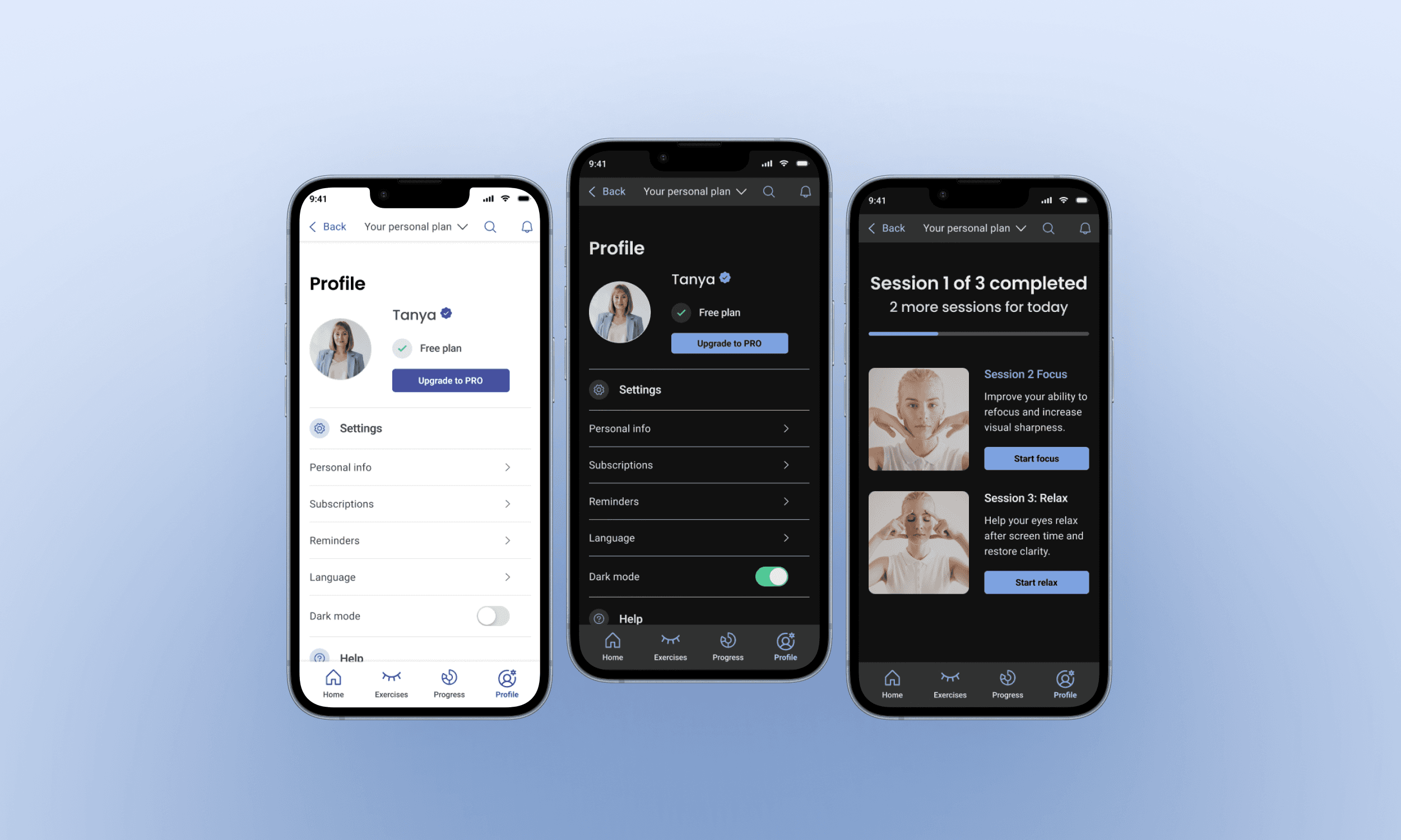 The journey begins with a seamless sign-up and quickly guides users through a short vision test and onboarding that tailors the training plan to their needs.