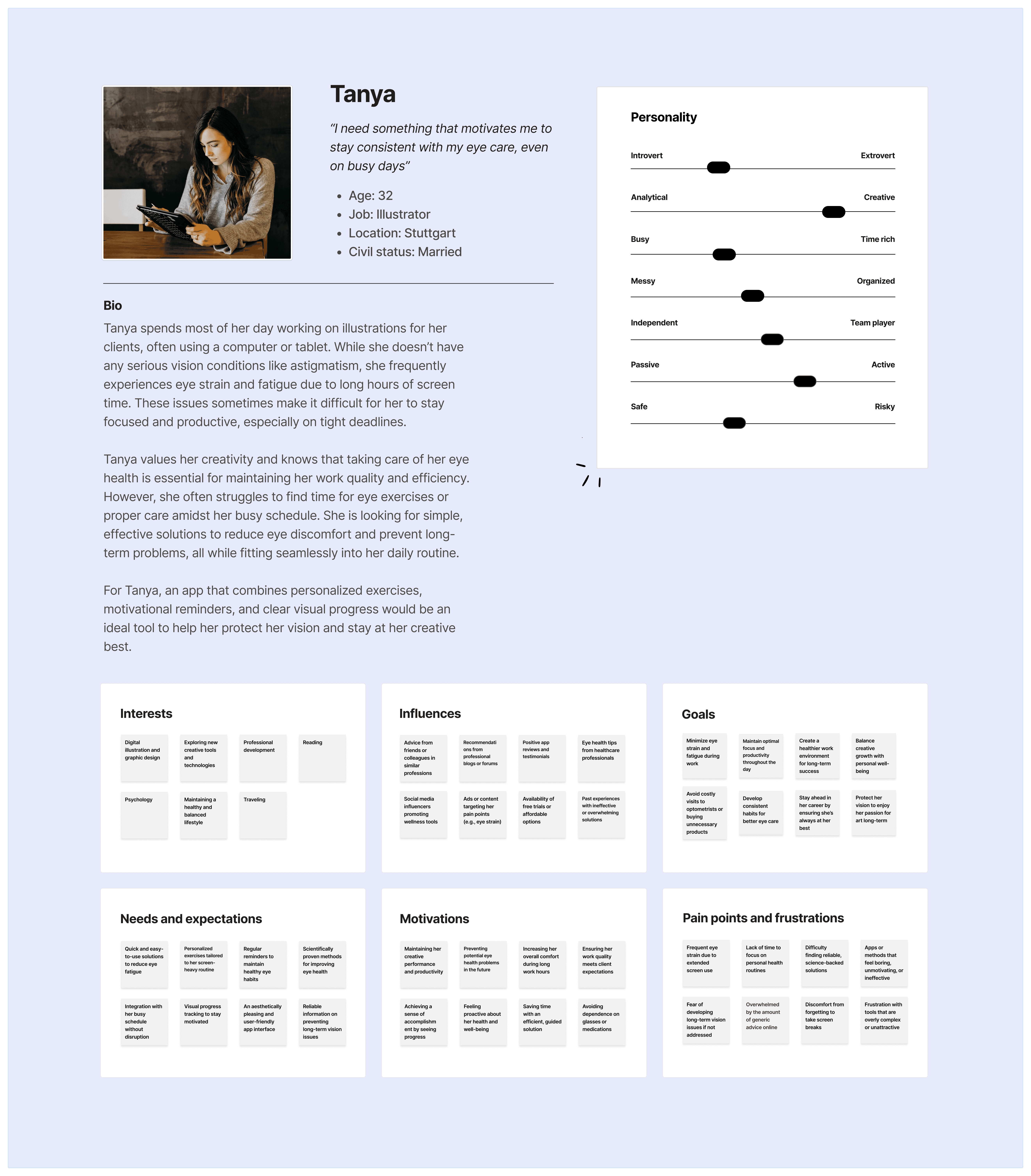 She wants to build small but consistent habits around eye care: taking short breaks, doing 5-minute daily exercises, and giving her eyes time to relax and recover. For her, the ideal solution would be gentle, personalized, and simple enough to integrate into her creative daily flow, even on her busiest days.